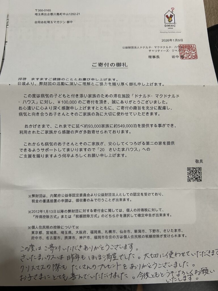 合同会社埼玉マガジンは2025年12月23日にマクドナルドハウス様に少額ですが100,000円を寄付をさせていただきました。